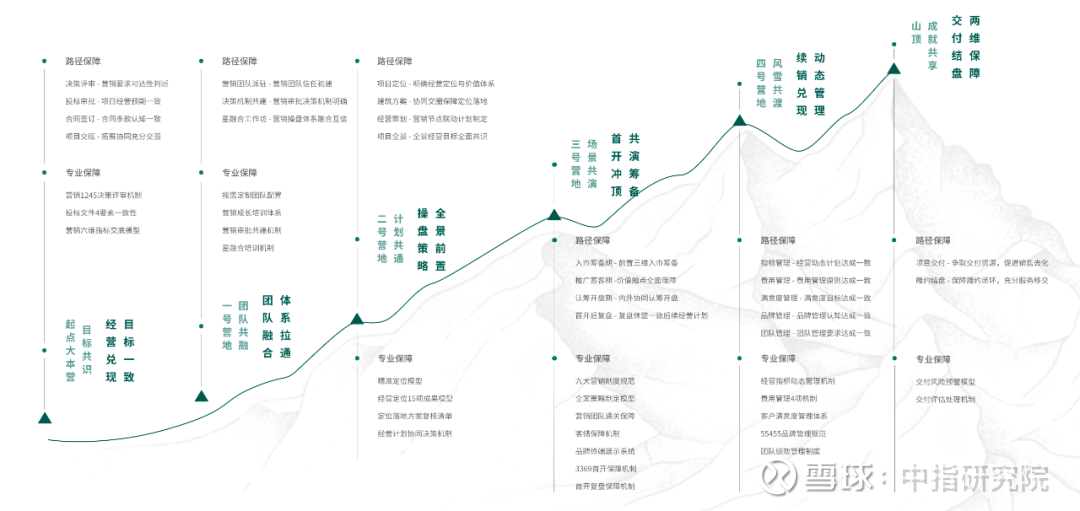 在持续精进产品力的同时,绿城管理不断打磨和优化营销体系,2024年推出《营销六力模型》、《绿城管理代建营销全流程操盘手册》、《营销登峰价值宝典》三大模型的系统化应用。《绿城管理代建营销全流程操盘手册》承接绿城管理“M登山模型”,用【六大登山营地】对应营销服务的六个主要环节,以六大阶段的【标准动作】,实现经营兑现的全流程把控。产品端和营销端两方面的优异表现共同推动项目高效去化,绿城管理2024年合同销售金额1050亿,在房地产大环境深度调整的时期能够保持良好韧性,为B端委托方兑现经营价值。