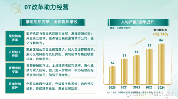 2024年,绿城管理启动强力改革,优化组织架构、推行区域包干经营、强化业绩与收入挂钩、推行全面数字化转型等举措,销售和管理费用支出从6.19亿下降至5.72亿,同比下降7.6%,人均代建费产值提升至84万/人,近五年人均年贡献收入复合增长率达12.74%,持续提质增效。