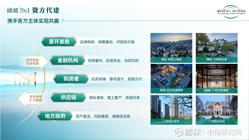 代建纾困业务潜力巨大,但具体实施复杂且困难,绿城管理不断探索纾困新路径。例如,绿城管理与东方资产合作了绿城·昆明云筑臻邸项目,与长城资产合作盘活绿城·武汉桂湖雲翠项目,与中国人寿在珠海合作了港珠澳未来城项目,与余姚市国资委旗下投资公司合作余姚云湖尚府项目。特别是绿城·武汉桂湖雲翠项目,在纾困背景及历史遗留问题下克服多重困难打造优质产品,并搭配超2万㎡全维实景示范区的高品质呈现,多重营销赋能动作加持,两度开盘均创造热销盛况,开盘当月累计热销约6亿,树立行业纾困代建标杆。