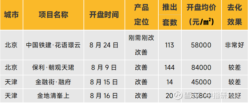 根据中指监测,2025年8月4日-2025年8月31日华北大区重点城市北京、天津两个城市累计开盘4个,推出房源291套,推出房源量环比下降84.7%。总体来看,楼市传统淡季期,华北大区整体开盘数量有限,去化效果亦呈分化态势,其中北京的中国铁建·花语璟云去化表现好。