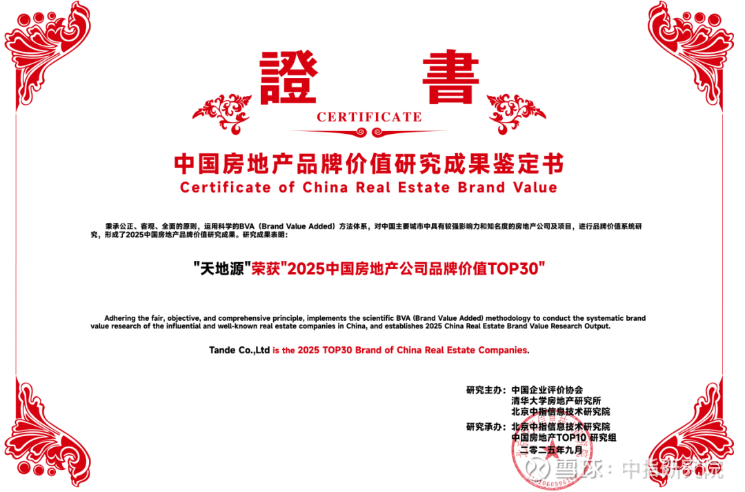 2025年房地产行业正处于从“规模竞赛”转向“价值竞争”的关键时期,当前品牌企业正从追求“规模”转为追求“效益”,从追求“数量”转为追求“质量”,不断探索新的发展路径。天地源通过文化地产特色、转型升级、创新发展的多维发力,走出了一条兼顾稳健与创新的转型路径,获得“2025中国房地产品牌TOP30”、“2025中国房地产产品力优秀品牌”及“2025中国房地产综合开发领先品牌--文化地产”三项重磅荣誉。