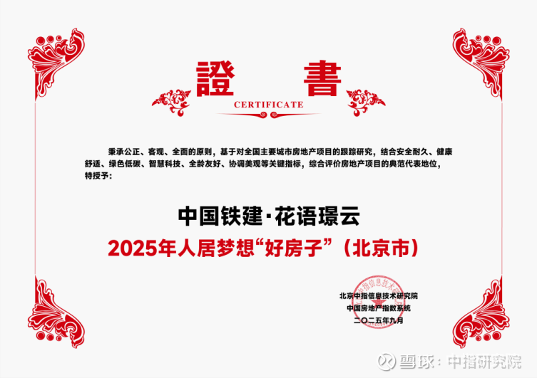 2025年9月11日,由中国企业评价协会、清华大学房地产研究所、北京中指信息技术研究院主办,北京中指信息技术研究院中国房地产TOP10研究组承办的“2025中国房地产品牌价值研究成果发布会暨第二十二届中国房地产品牌发展论坛”在北京召开。“2025年人居梦想‘好房子’”评选结果揭晓。中国铁建·花语璟云凭借其卓越的产品力、稀缺的城芯低密属性与全面的人居理念,荣膺“2025年人居梦想‘好房子’(北京市)”称号,成为北京城市副中心人居品质的典范之作。
