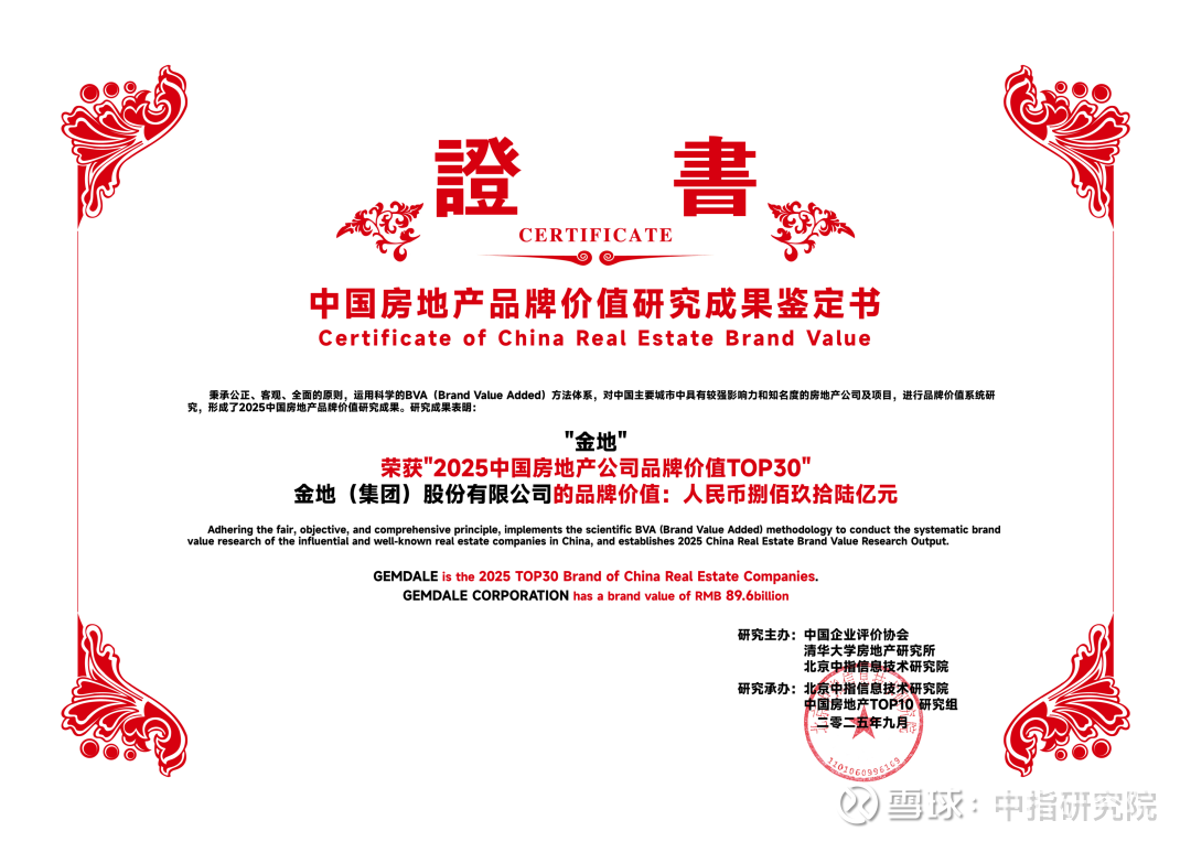 2025年9月11日,由中国企业评价协会、清华大学房地产研究所、北京中指信息技术研究院主办,北京中指信息技术研究院中国房地产TOP10研究组承办的“2025中国房地产品牌价值研究成果发布会暨第二十二届中国房地产品牌发展论坛”在北京国家会议中心隆重召开。凭借雄厚的综合实力以及不断攀升的品牌价值,$金地集团(SH600383)$ 荣获“2025中国房地产公司品牌价值TOP30”。