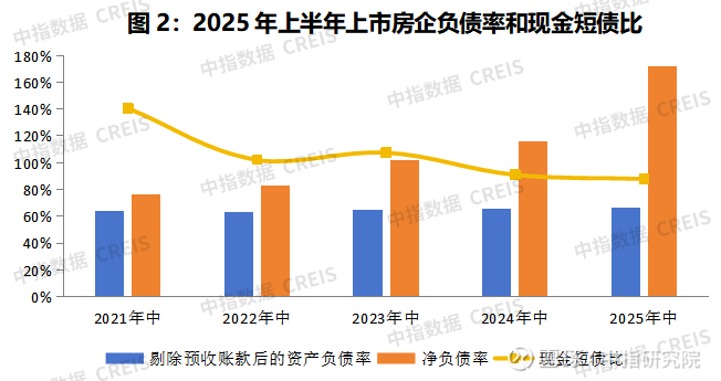 2025上半年,中国房地产上市公司财务风险持续攀升,偿债能力进一步弱化。数据显示,上市房企剔除预收账款后的资产负债率达66.5%,同比上升0.9个百分点;净负债率大幅上升至171.8%,同比激增55.8个百分点,反映出行业整体杠杆水平居高不下。这一现象主要源于货币资金规模的持续收缩,叠加市场低迷导致的存货及投资性物业资产贬值压力加剧。