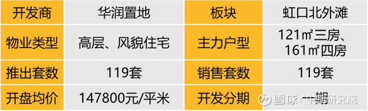 认购去化:外滩瑞府已于9月14日开盘,本次共计推出119套房源,主力户型为121/161㎡三、四房,均价147800元/㎡,一房一价,目前房源已售罄,去化率100%。
