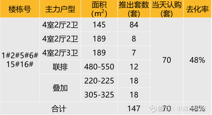 认购去化:2025年9月20日本项目推出毛坯联排6#、精装11F洋房15/16#,精装四代8F洋房1#,毛坯4F叠加2/5#,共计147套,开盘认购70套,去化率48%。
