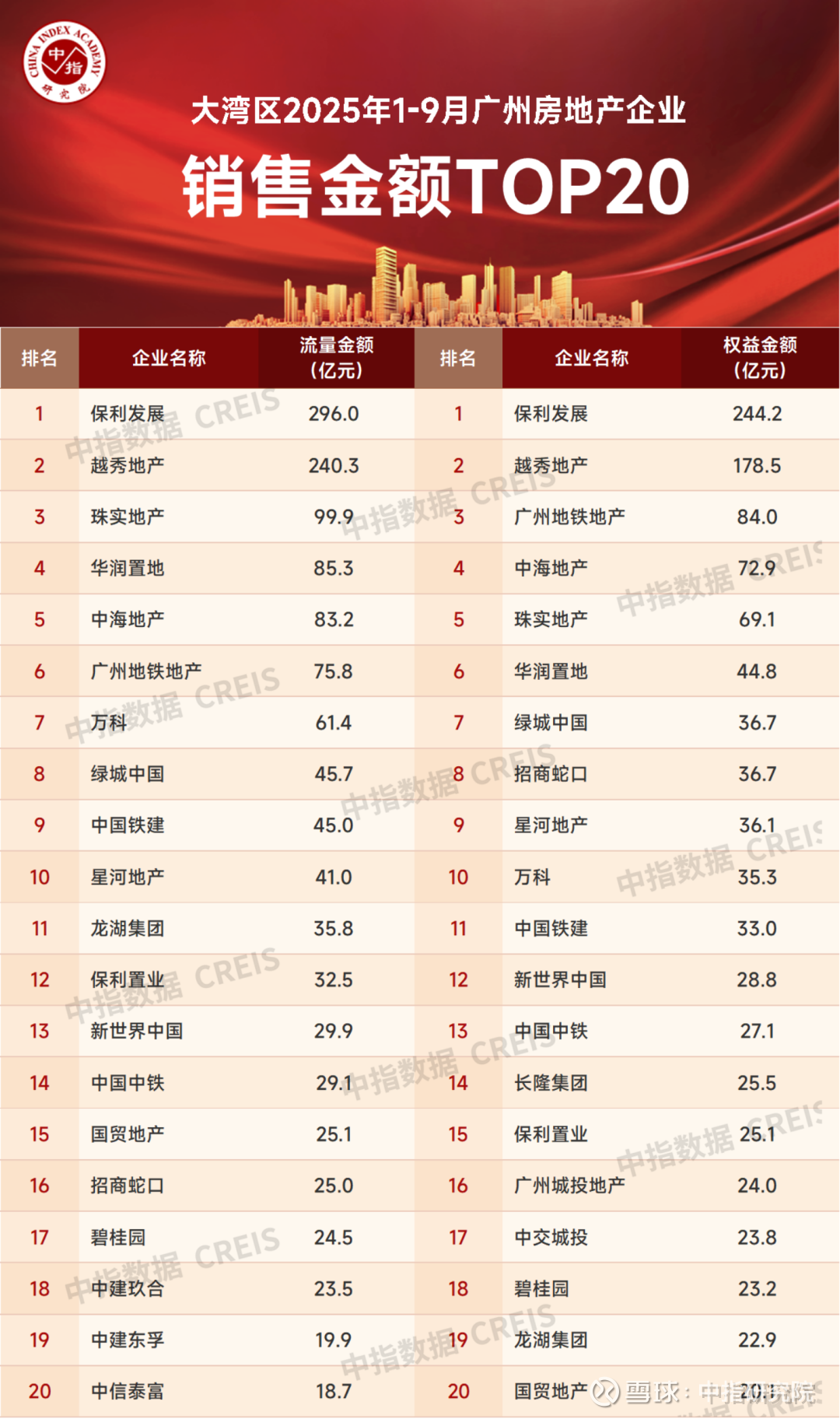 头部房企:保利发展凭借保利天奕、保利天曜、保利天瑞、保利燕语堂悦、保利珠江天悦等多个热销项目的优异表现,夺得广州2025年1-9月房企流量金额及权益金额榜单双冠军,流量销售金额及权益销售额分别为296亿元、244.2亿元。