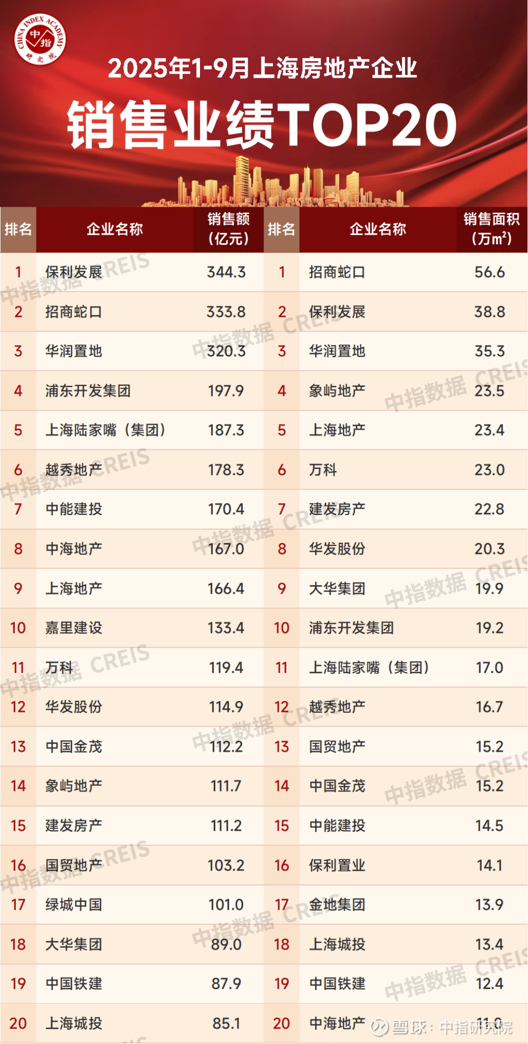 特别声明:房地产企业销售数据、项目销售数据、商品住宅市场数据统计均是以2025年1月1日-9月28日期间商品房合同销售额为统计口径,主要依据中指数据CREIS在上海的销售监数据;对于少数未在监测范围内的项目,由企业提供相关证明文件,经课题组对数据进行严格审核,纳入统计范围。本报告仅供参考,课题组不对使用报告及其内容所引发的任何直接或间接损失承担责任。