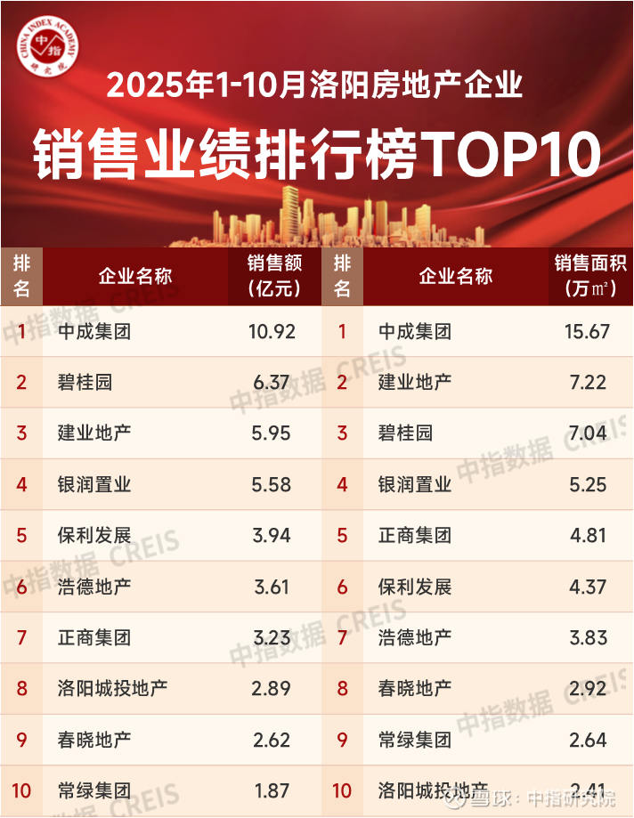 2025年1-10月,洛阳房地产销售金额TOP10企业合计销售金额为46.98亿元,销售面积TOP10企业合计销售面积56.16万平米。其中TOP10房企销售门槛值为1.87亿元/2.41万平米。