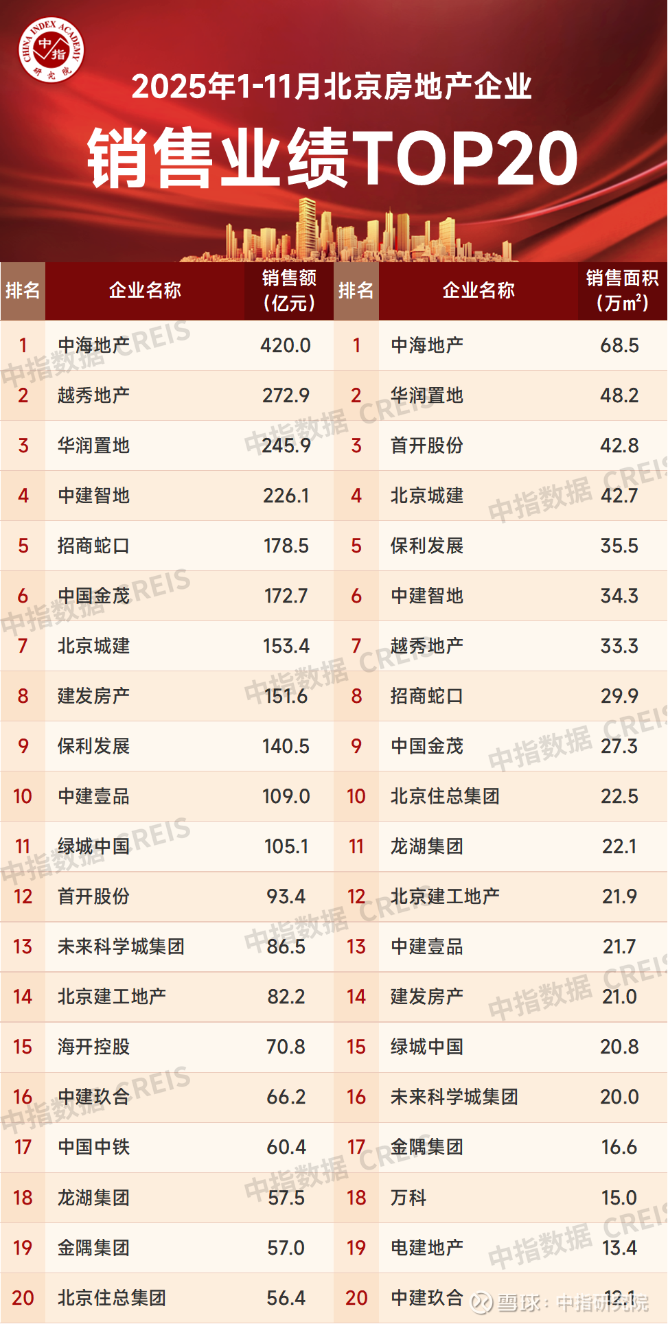 2025年1-11月,北京房地产企业销售额TOP20企业商品房销售金额合计2806.2亿元;TOP20企业商品房销售面积合计569.6万平,TOP20门槛值分别为56.4亿元和12.1万平。销售额方面,中海地产、越秀地产和华润置地位居前三位,其中,中海地产销售额为420.0亿元,位居首位;越秀地产销售额272.9亿元,位居第二位;华润置地销售额为245.9亿元,位居第三位。