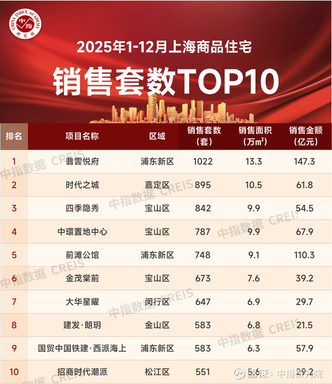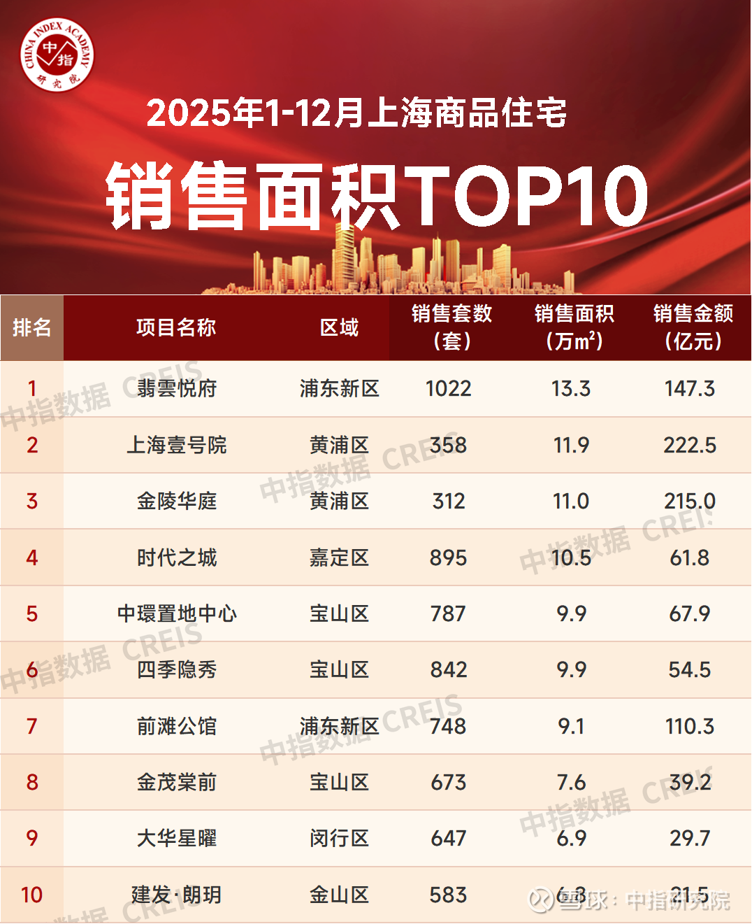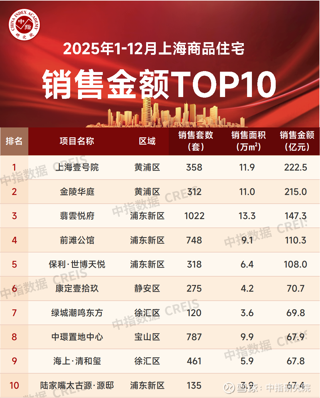 特别声明:房地产企业销售数据、项目销售数据、商品住宅市场数据统计均是以2025年1月1日-12月24日期间商品房合同销售额为统计口径,主要依据中指数据CREIS在上海的销售监数据;对于少数未在监测范围内的项目,由企业提供相关证明文件,经课题组对数据进行严格审核,纳入统计范围。本报告仅供参考,课题组不对使用报告及其内容所引发的任何直接或间接损失承担责任。