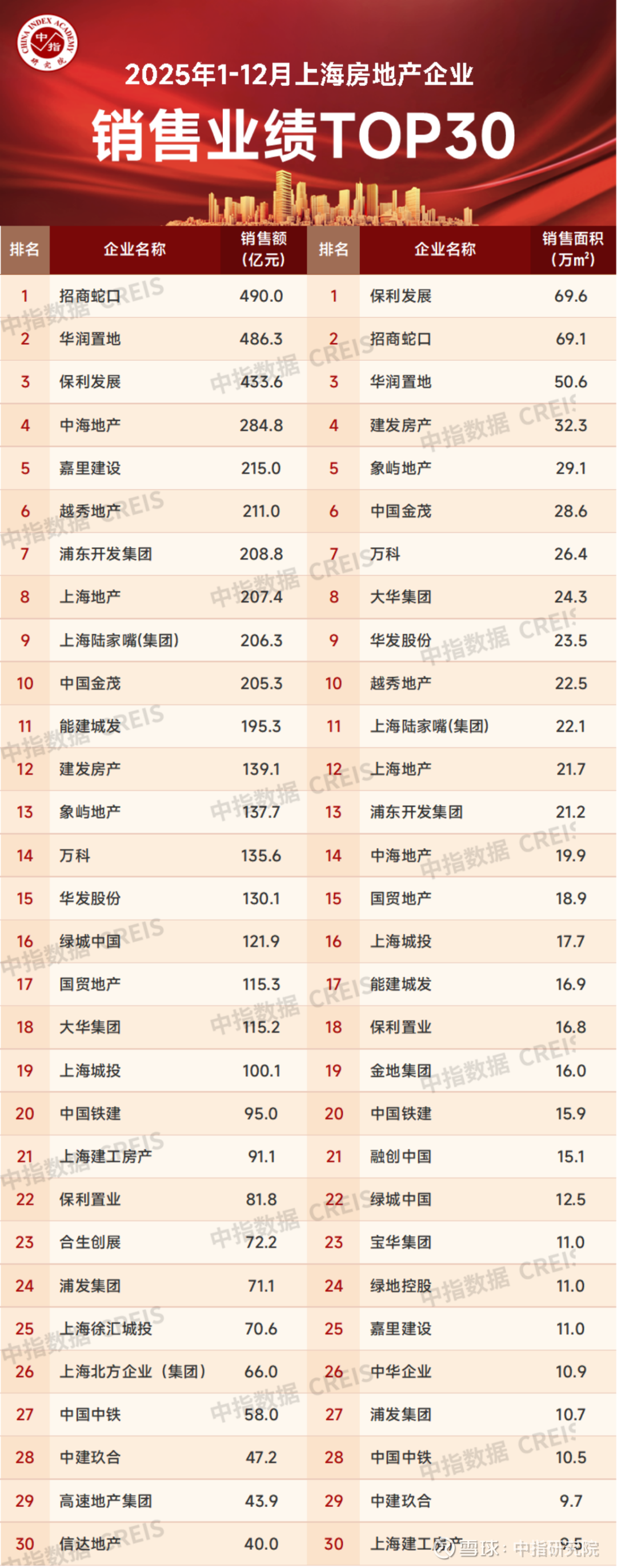 2025年1-12月,上海房地产销售业绩TOP30企业合计销售4875.6亿元;销售面积TOP30企业合计销售674.8万平。销售额突破200亿元的房企有10家,其中招商蛇口、华润置地、保利发展分别以490.0亿元、486.3亿元和433.6亿元获得销售金额榜前三名;销售面积榜达到20万平以上的房企有13家,保利发展、招商蛇口、华润置地分别以69.6万平、69.1万平和50.6万平获得前三名。