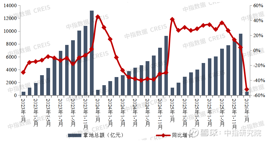 图:2023年-2026年1月TOP100房企累计拿地总额及同比