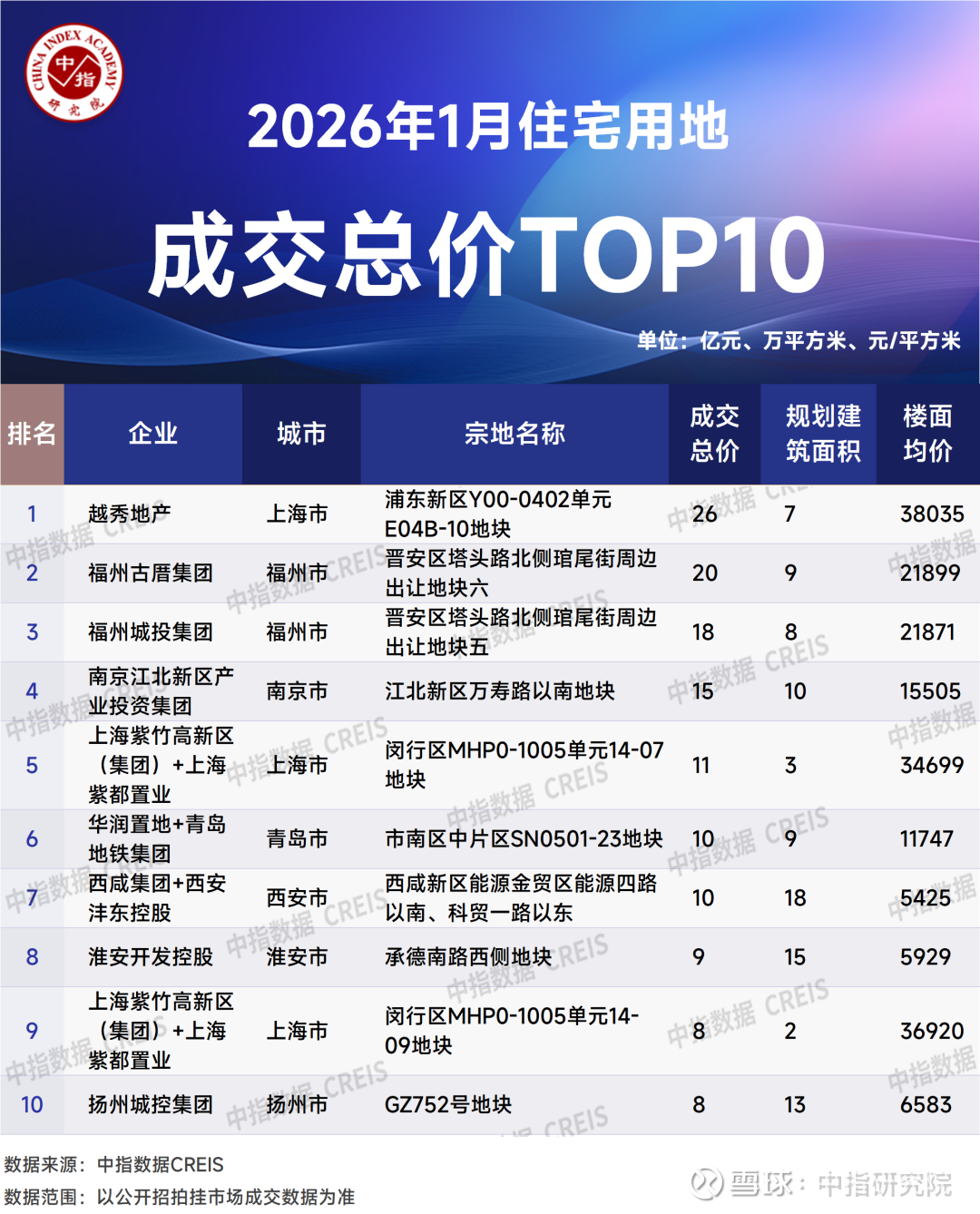 2026年1月,TOP100企业拿地总额579.9亿元,同比下降52.1%。房企开年拿地同比降幅较高,一方面是上年同期基数较高,2025年1月TOP100企业拿地总额同比增长四成多;另一方面,开年房地产市场仍存在不确定性,企业上年积极补仓的背景下拿地热度有所减弱,这也延续了上年四季度拿地热度走低态势。从拿地企业来看,央国企仍然是主力,拿地金额前十企业中多为地方国企,越秀地产、国贸地产、华润置地等大中型央国企拿地金额位居前列。