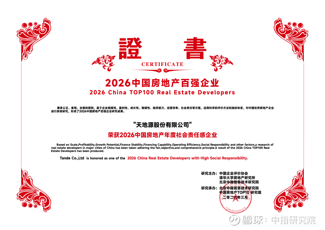 本次大会以“攻坚克难,砥砺前行”为主题,聚焦行业高质量发展路径,表彰了一批在综合实力、经营稳健性及社会责任感方面表现突出的企业。西安高科集团有限公司旗下的上市国企(股票代码600665)——天地源股份有限公司凭借其坚守初心、稳健前行的经营理念、以双引擎驱动创新的发展模式、匠心筑就美好人居的产品追求以及国企的责任担当,再次荣登“2026中国房地产百强企业”,并斩获“2026中国房地产年度社会责任感企业”、“2026房地产百强企业--稳健性TOP10”等多项荣誉。