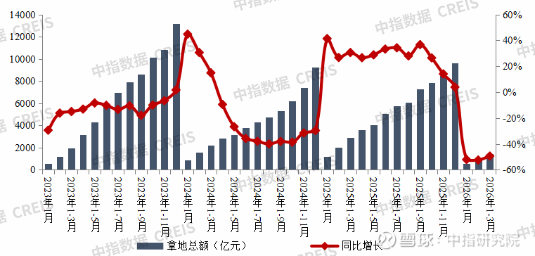 图:2023年-2026年3月TOP100房企累计拿地总额及同比