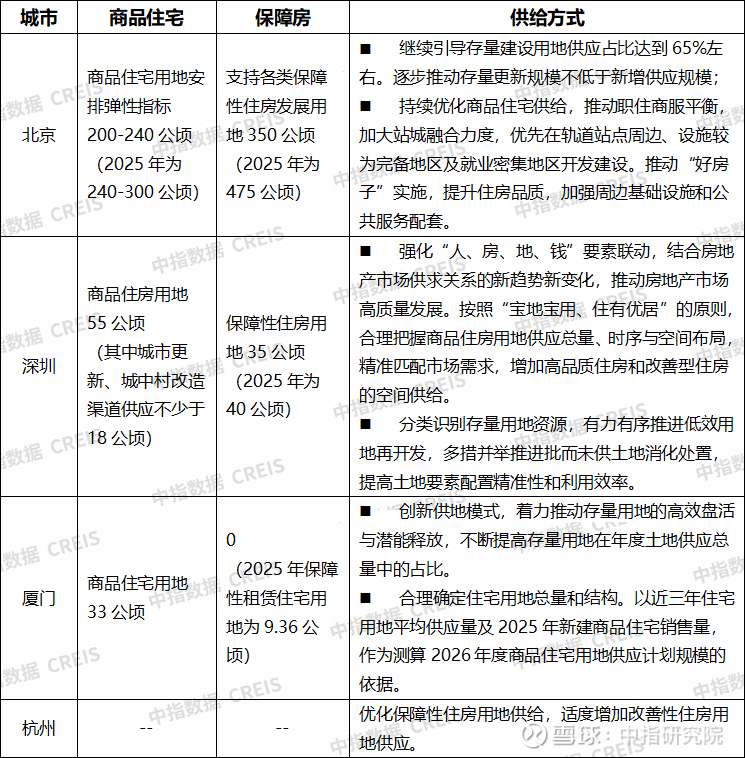 在控增量方面,各地普遍调减年度供地规模,其中北京商品住宅用地供应计划降至200-240公顷,较2025年减少40-60公顷,厦门则明确提出以近三年平均供应量及2025年实际销售量作为测算依据,通过缩量供应适配当前市场去化节奏。