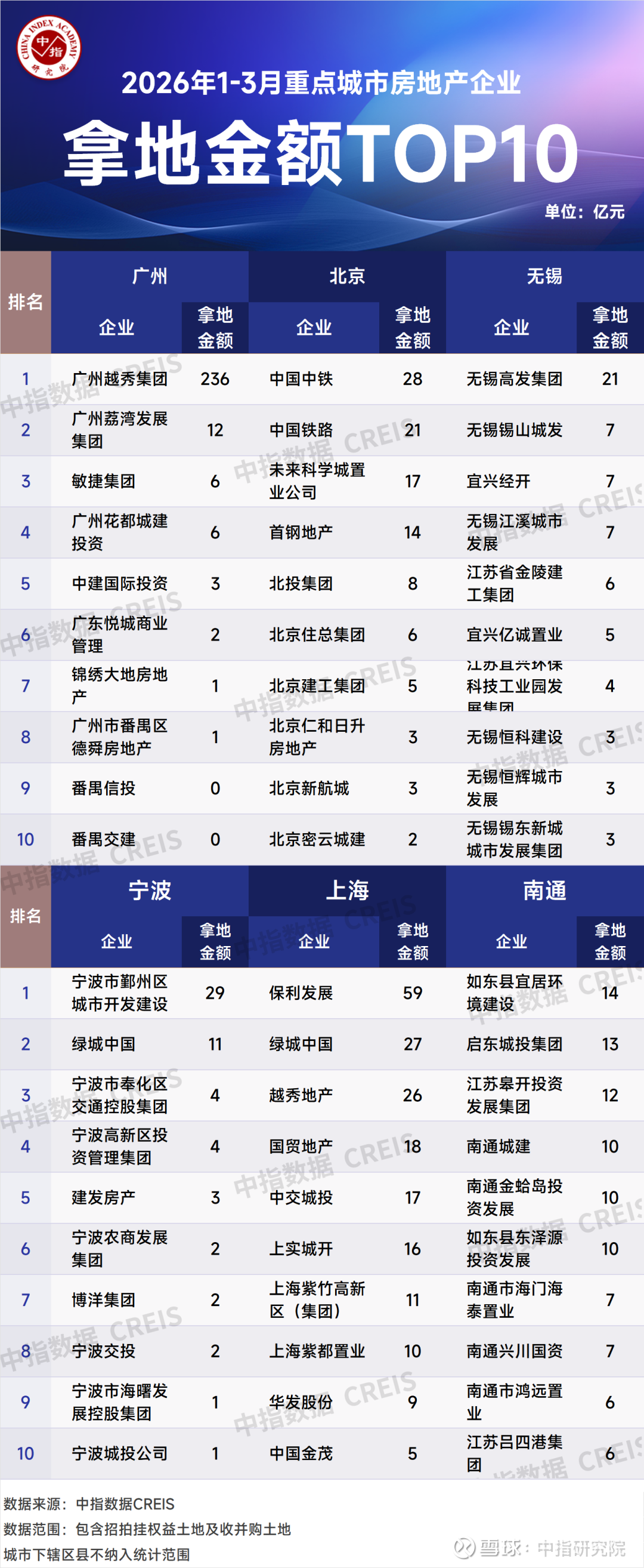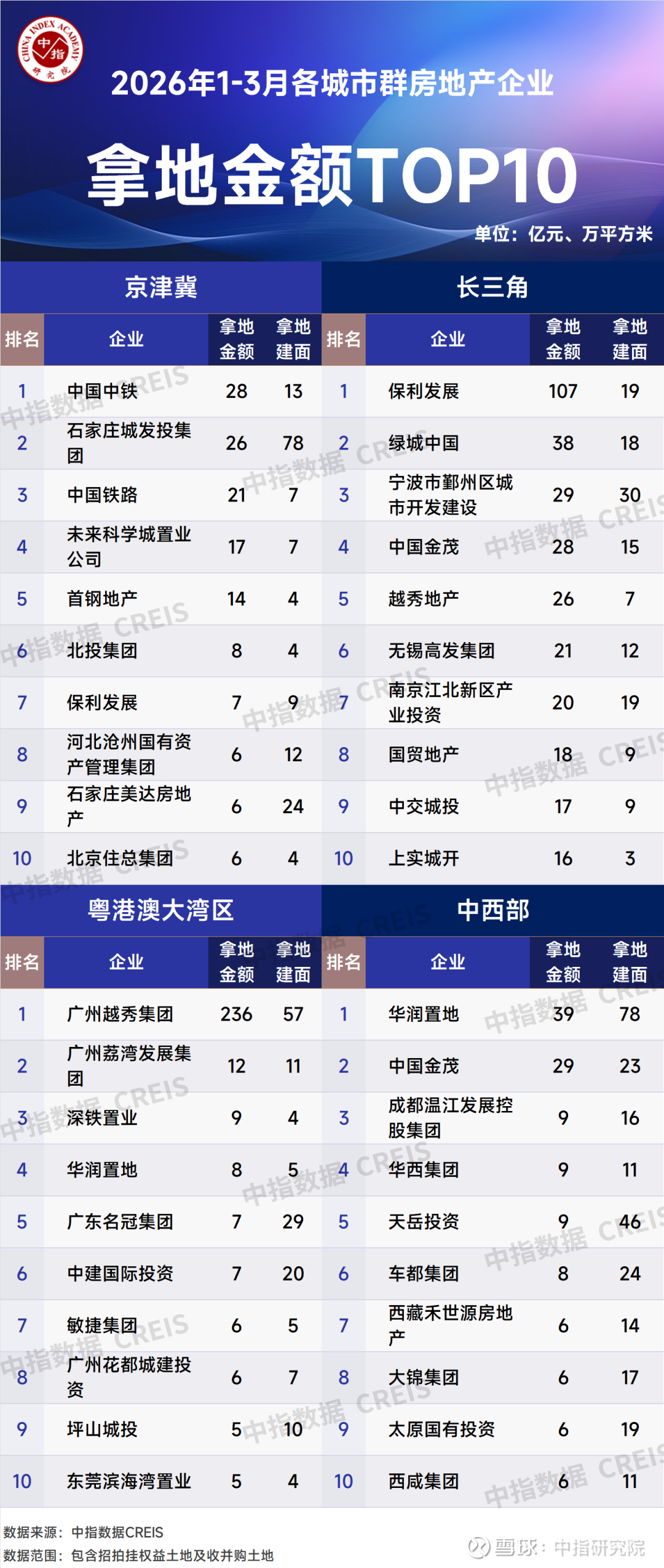 从各城市群拿地金额来看,四大城市群房企拿地格局呈现显著分化。2026年1-3月,四大城市群房企拿地格局呈现显著分化,长三角热度最高、总量领跑,保利发展以107亿元拿地金额居首,绿城中国、中国金茂等头部企业积极布局,整体参与度领先。粤港澳大湾区呈“一枝独秀” 格局,广州越秀集团凭236亿元巨额拿地独占鳌头,拉动区域总量,其余企业拿地规模普遍偏小。京津冀拿地总额偏小,央企和地方国资居前,本土国企托底意味浓厚。