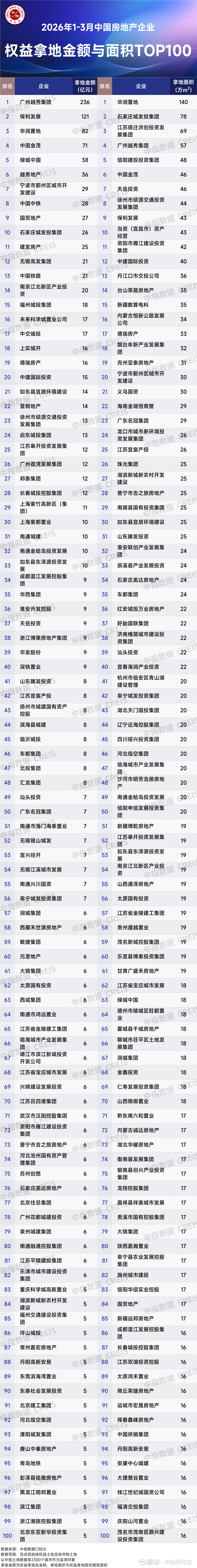 2026年1-3月,TOP100企业拿地总额1465.2亿元,同比下降49.4%,降幅较上月收窄3.0个百分点。春节假期结束后,各地土地推出和成交有所恢复,上海、杭州等城市均有热点地块推出,房企拿地力度较上月有所回升,拿地金额降幅收窄。核心城市优质地块高热,杭州上城区城东新城宅地经109轮竞价,以总价32.2亿元、溢价率51%由保利获取。从拿地企业来看,央国企仍然是主力,保利发展、华润置地、中国金茂、越秀地产等大型央国企拿地金额位居前列。