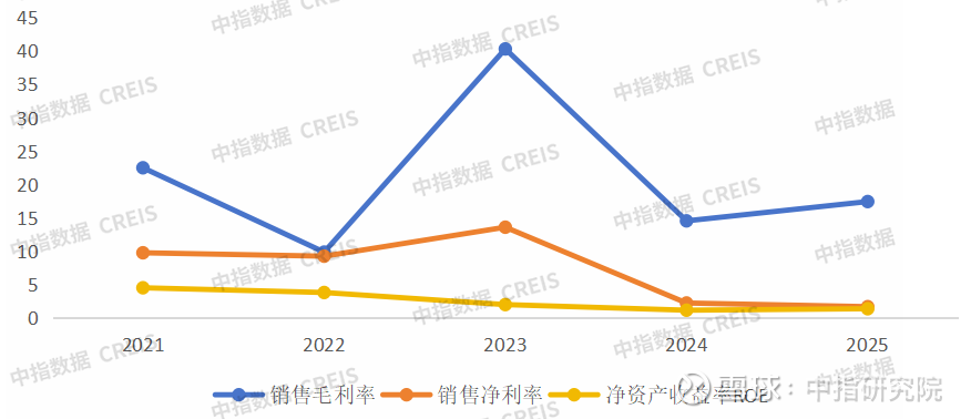 毛利率的异常波动揭示了业务结构的不稳定性。2022年毛利率从22.49%骤降至9.86%,这直接映射了当年房地产行业深度调整对公司核心业务——房产销售的冲击。2023年毛利率飙升至40.29%,这并非主业改善,而是由于高毛利的特许经营权项目收入占比临时提升至9.01%,这种由小众业务占比变化引发的结构性波动不具备持续性。2024-2025年,随着房产销售占比重回95%以上,毛利率回落并稳定在14-17%的区间,2025年回升至17.43%,显示主业盈利水平在行业修复中有所改善。