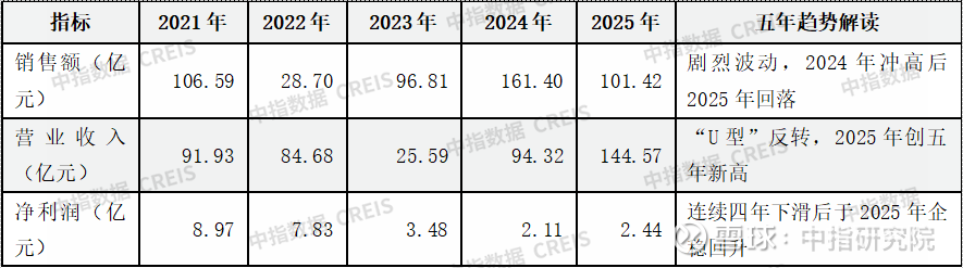 营业收入的演变则呈现出明显的“滞后确认”特征,其趋势与销售额并不同步。2021-2022年收入保持相对稳定,但2023年却出现断崖式下跌,同比下滑69.8%,这并非业务规模的实质性收缩,而是由于房地产行业特有的收入确认规则,导致前期销售额未能及时结转为当期收入,出现了项目结算的“空窗期”。2024-2025年,营业收入迎来爆发式增长,尤其是2025年同比大幅增长53.3%,这标志着前期销售成果进入集中结算期,核心驱动力正是上海露香园二期等重点项目进入交付与结算高峰。