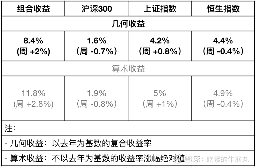 本周开始换下收益率统计方式,更科学的是看几何收益(即今年相对去年的复合收益)。