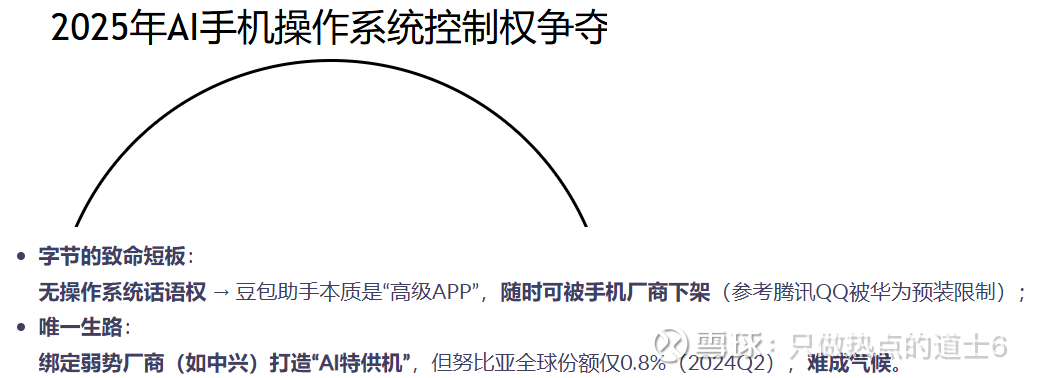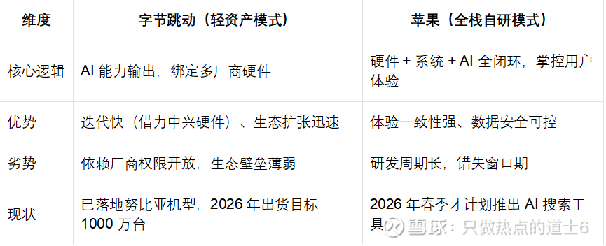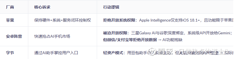 关键结论:字节抓住安卓阵营 “自研 AI 能力不足” 的窗口期,用 “AI 助手 + 多厂商合作” 快速抢占市场;苹果因坚持全栈控制错失先机,但长期仍具生态壁垒。谷歌(手握安卓系统)是唯一能同时具备 “底层控制 + AI 能力” 的潜在对手。