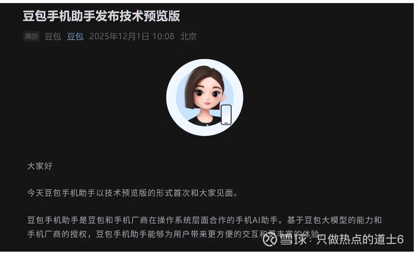 4、2025年12月1日,字节发布豆包手机助手预览版,已在豆包手机助手官网及中兴商城上架,售价 3499 元。这是一个面向手机厂商的系统级服务,它将豆包大模型深度融入操作系统,让用户只需动嘴(或动一下手指),就能指挥手机去执行那些原本需要点击几十次屏幕的繁琐操作。