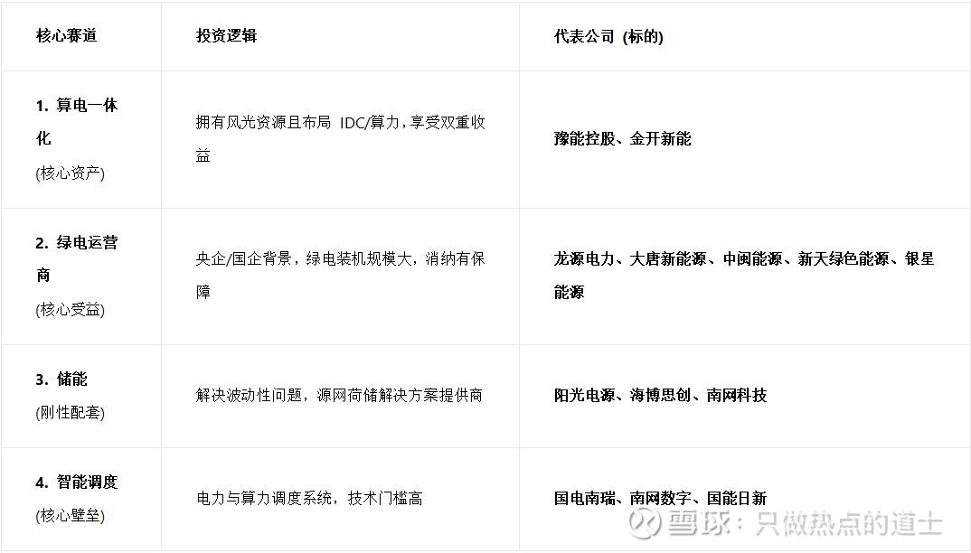 第一梯队:算电一体化(核心资产)手握风光储资源 + 算力 / IDC 布局,直接享受绿电溢价 + 算力收益双重红利。