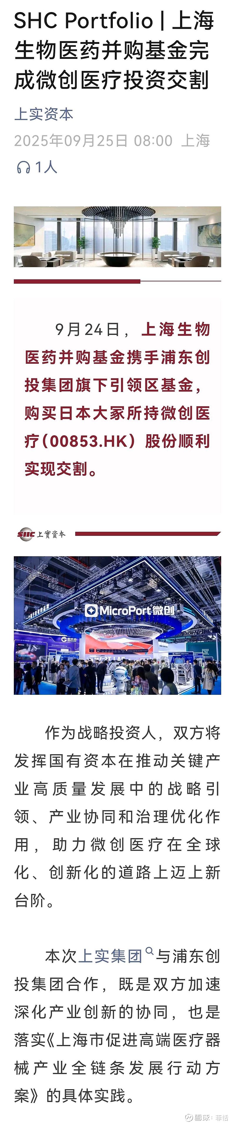 $微创医疗(00853)$新时代开启!SHC Portfolio | 上海生物医药并购基金完成微创医疗投资交割9月24日,上海生物医药并购基金携手浦东创投集团旗下引领区基金,购买日本大冢所持微创医疗(00853.HK)股份顺利实现交割。