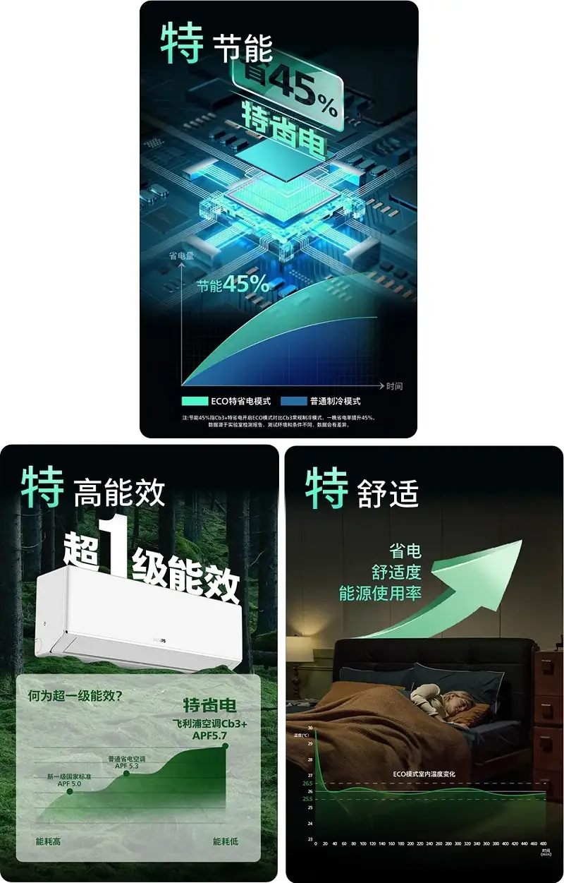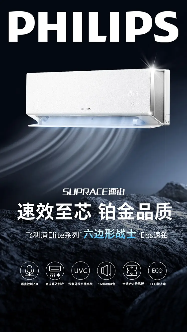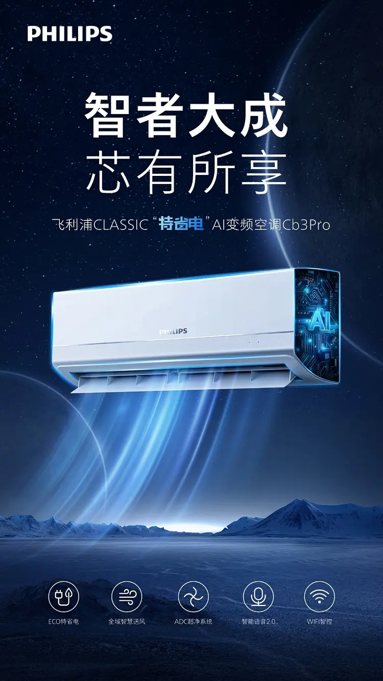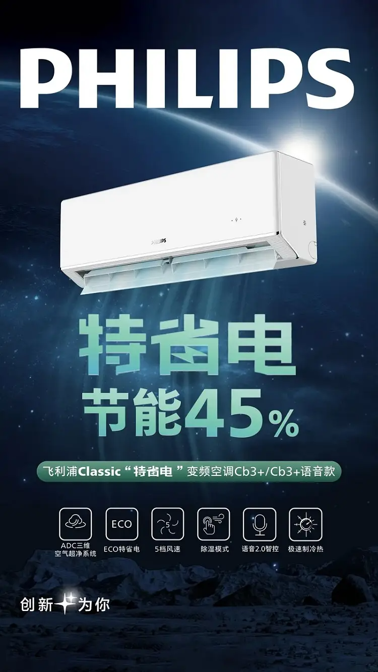 在家用产品方面,飞利浦CLASSIC“特省电”变频空调Cb3+、Cb3Pro及ELITE系列Ebs速铂均全面搭载“ECO特省电”技术。这些机型在制冷和制热过程中不仅控温更精准、运行更安静,节能效果也更明显。