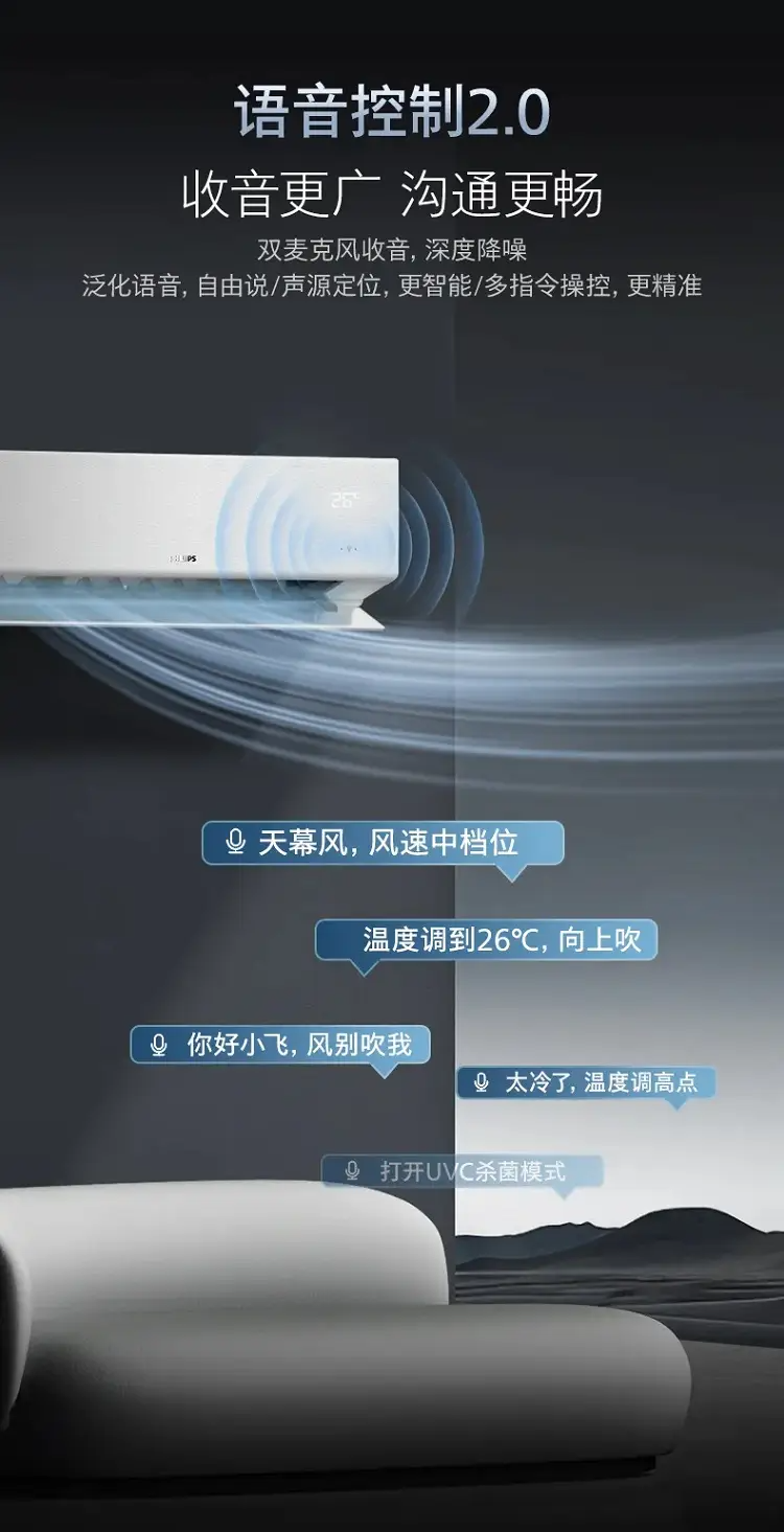 语音控制2.0,让冷暖听得见。支撑声源定位、泛化语音、多指令操控,收音更广,沟通更畅,只需一句话,舒适生活瞬间到位,智能交互,精准响应,让消费者与家的沟通,前所未有的顺畅自如。