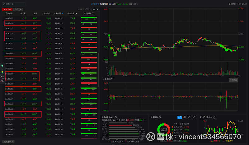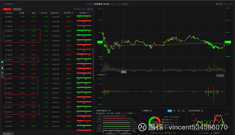 $拓普集团(SH601689)$ 数了一下从14点23分到14点40分,1000手、2000手、3000手整数及相差不多的成交单,因为下单手数太一致,基本可以认为是一个人所为,这些单加起来有350万股,再考虑之前还有很多500整手的,大约去到450万股,基本可以认为除了前十大股东之外,其他股东短时间不太可能抛出这么多的股票,结合最近的市场情况,个人推断这两天的抛单大概率来自赎回沪深300ETF并转换成一篮子股票之后的抛单