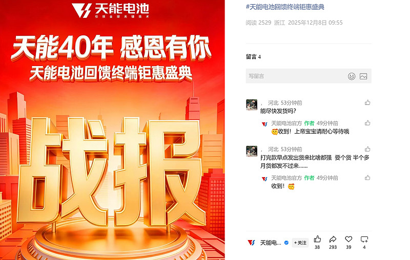 按照天能公众号后面的留言,显示天能目前是先款后货,供不应求状态