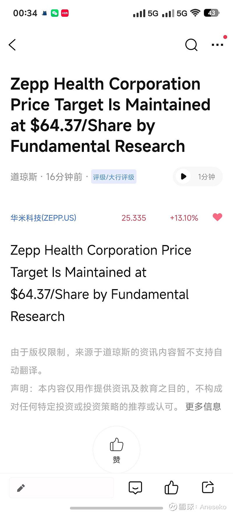 华米股价最新评级维持在64.37美金。