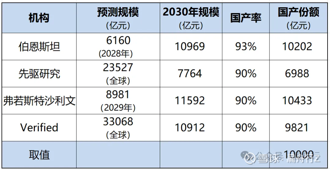 几家研究机构预测如下图,先驱研究预测2030年市场规模最低,仅为7764亿元,这个预测值偏低。