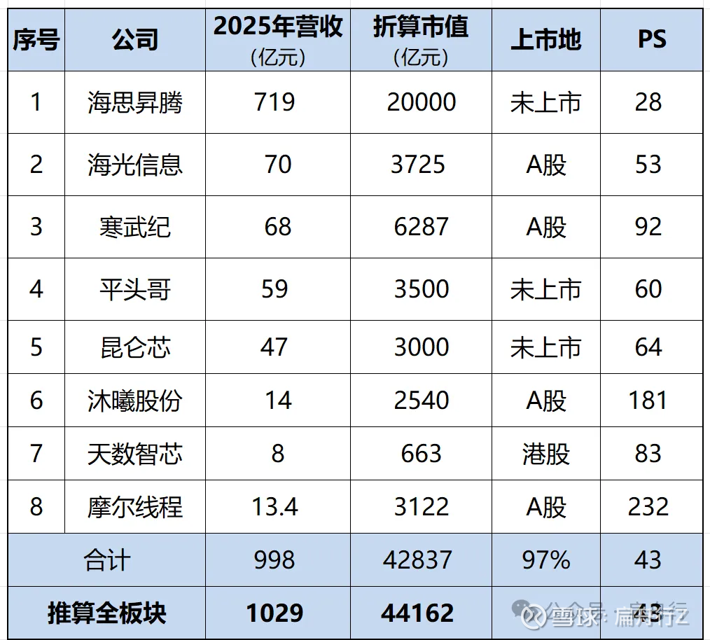 2025年国产AI芯片公司主要包括以下8家,折算总市值42837亿元,营收占比97%,推算板块总市值为44162亿元。