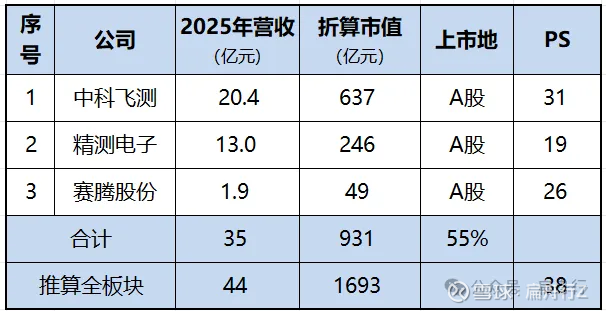 已上市的主要三家营收占比虽在80%以上,考虑到新凯来以及其他诸多厂商的潜力,市值占比取55%,推算全板块总市值约为1693亿元。