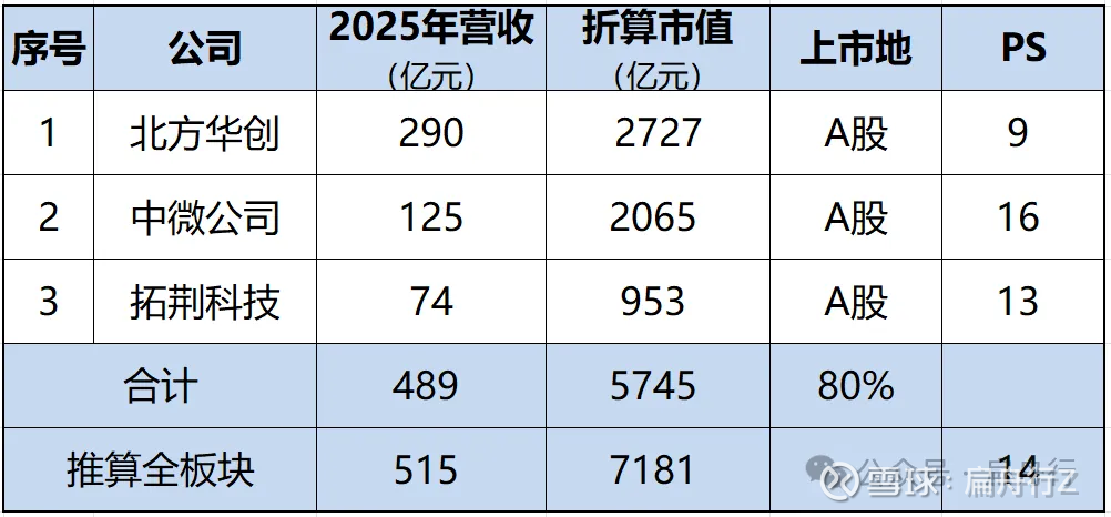 然后,统计各板块2025年国产营收、市值,计算“前瞻广义市销率PS”: