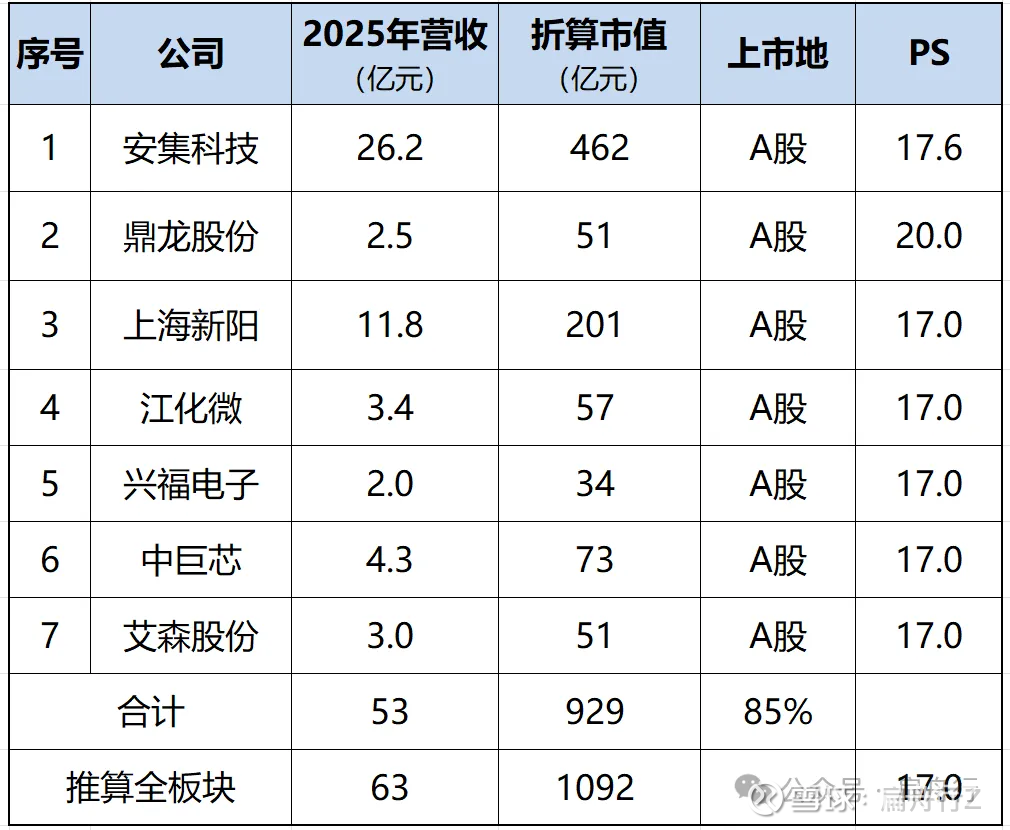 2025年营收合计约859亿元,占比约53%。考虑到中芯国际、华虹在高端制程的布局,应给于更高的估值,市值占比取60%,推算全板块总市值约23379亿元。