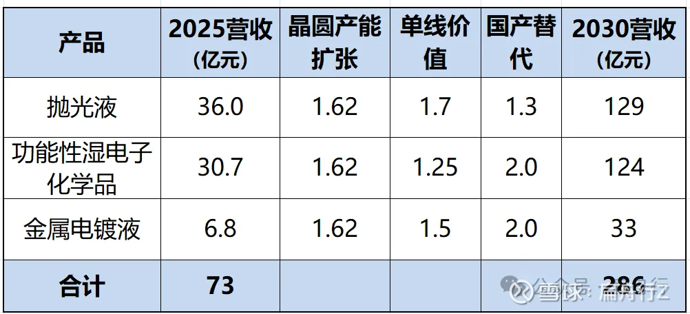 抛光液、功能性湿电子化学品、金属电镀液2025年国产营收合计约73亿元。