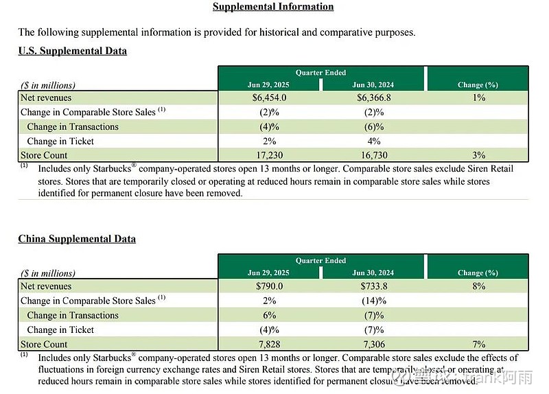 $瑞幸粉单(LKNCY)$ $星巴克(SBUX)$北美同店降2%,其中交易笔数降2%,ASP升4%中国同店升2%,其中交易笔数升4%,ASP降6%降价格保收入,可利润惨不忍睹,从去年10亿到降到今年5.6亿刀(同比-47.1%)对比机构给瑞幸Q2的112亿元收入预测,星巴克中国只有瑞幸季度收入的35.8%了,越来越明显的剪刀差;BUT,中国区收入稳住的话,SBUX在花街就是好学生,没办法,亲儿子晚上看看瑞幸这边的情况