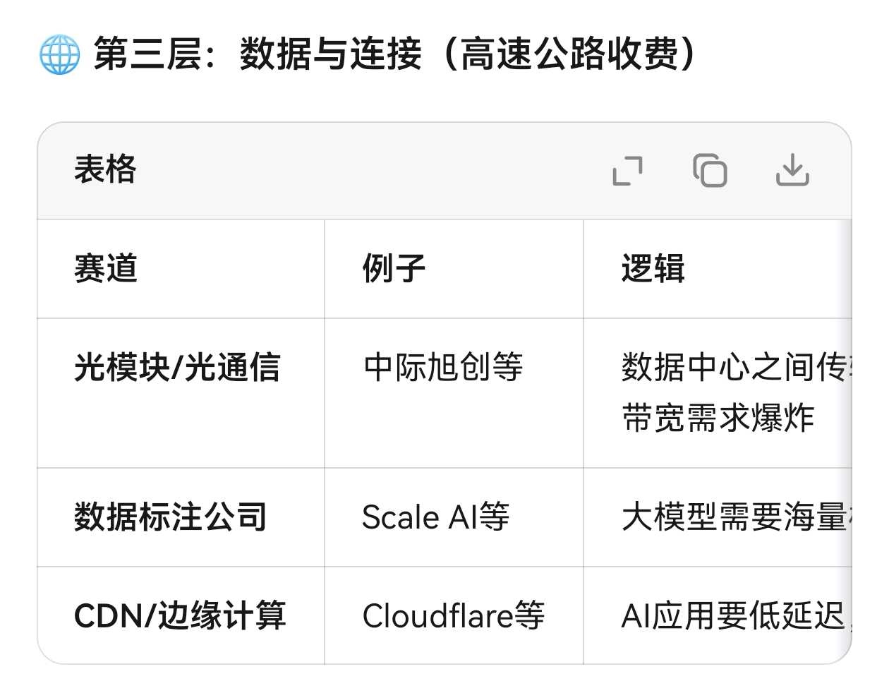 第三层,数据与连接(高速公路收费)。印象中,光模块光通信之前还大涨了一波。
