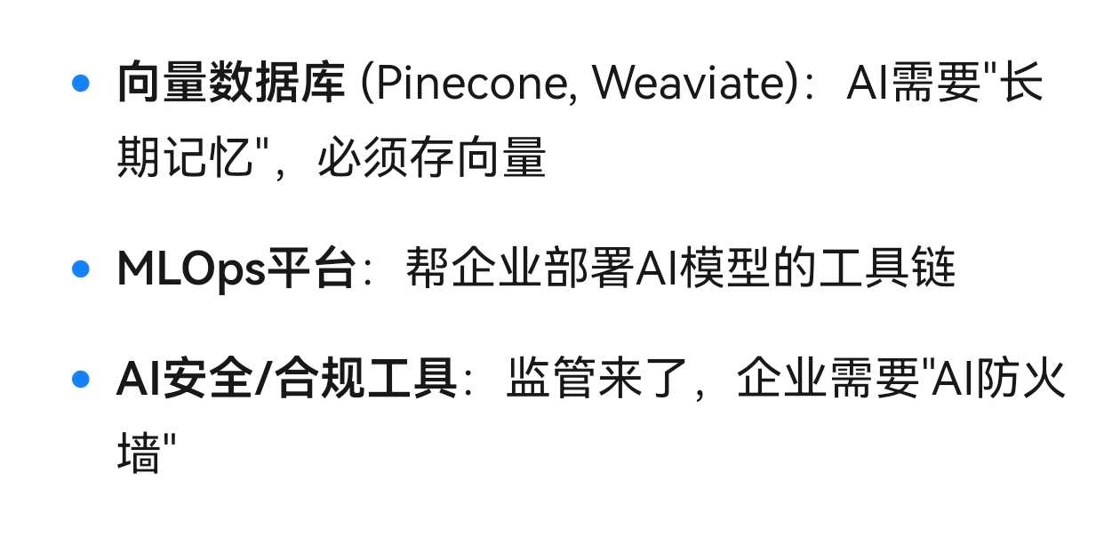 第四层,AI开发工具(卖牛仔裤给开发者)。我老公的新东家就是做AI开发工具的,重点优化AI搜索环节,然后把服务卖给做AI大模型的公司。