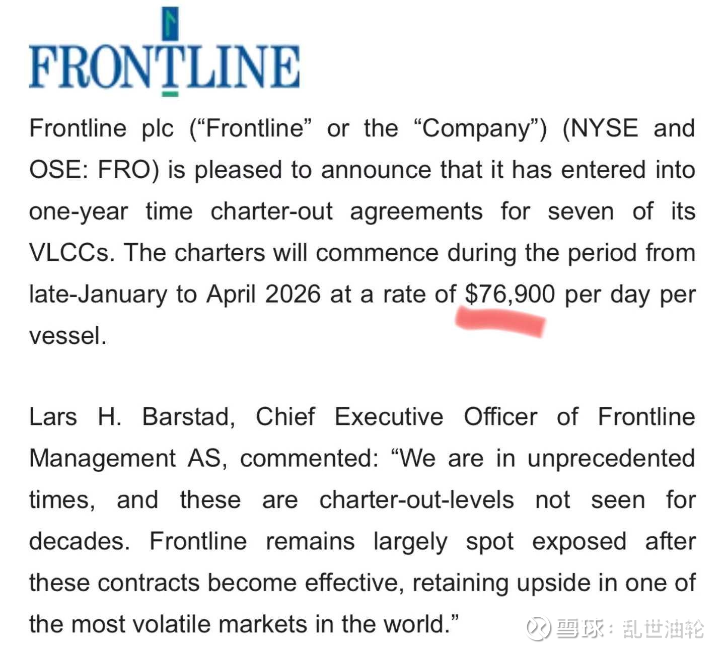 - 价格水平:7艘VLCC,1年期租约日租金7.69万美元/日,显著高于2025年四季度期租均价(约4.9万美元/天)和最新克拉克森评估值6.35万美元/天,“创几十年新高”。