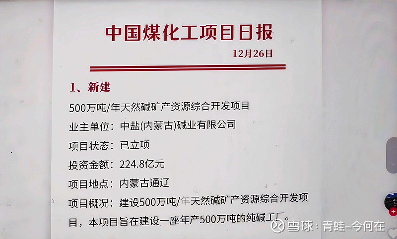 $中盐化工(SH600328)$ $博源化工(SZ000683)$中国煤化工项目日报12月26日1、新建500万吨/年天然碱矿产资源综合开发项目业主单位:中盐(内蒙古)碱业有限公司项目状态:已立项投资金额:224.8亿元项目地点:内蒙古通辽项目概况:建设500万吨/年天然碱矿产资源综合开发项目,本项目旨在建设一座年产500万吨的纯碱工厂