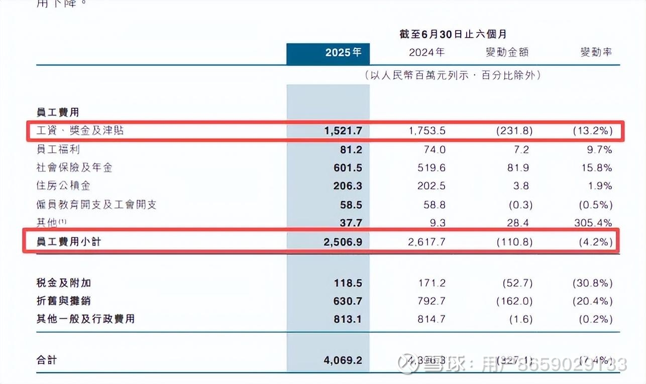 对比可以发现,2024年员工费用为64.69亿元,同比增加2.51亿元,增幅4%,费用减少发生在折旧与摊销、其他一般及行政费用,而2025年中报中员工费用、折旧与摊销、其他一般及行政费用均出现下滑,其中员工费用为25.07亿元,同比减少1.19亿元,降幅4.2%,主要是工资、奖金及津贴支出减少所致,金额为15.22亿元,同比减少2.32亿元,降幅13.2%。