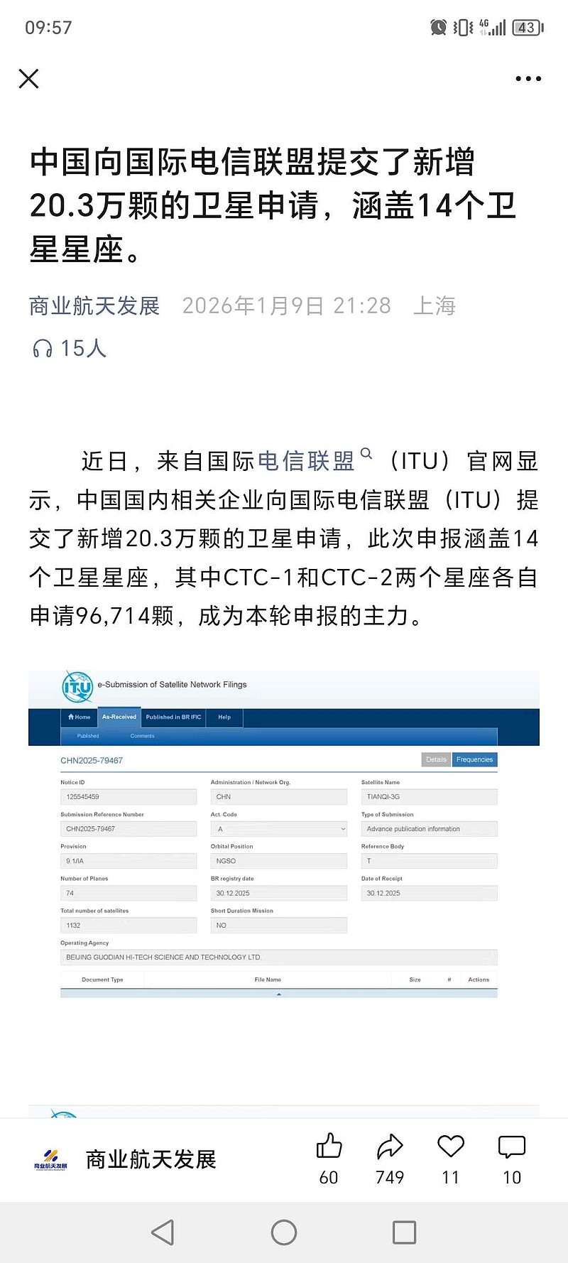 近日,来自国际电信联盟(ITU)官网显示,中国国内相关企业向国际电信联盟(ITU)提交了新增20.3万颗的卫星申请,