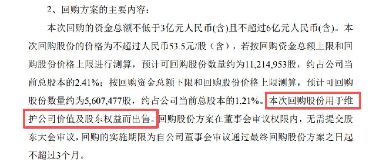 鉴于公司股价低于每股净资产,管理层认为当前股价不能反映公司价值,为维护公司股东权益,拟在未来三个月以内,回购公司股份不低于3亿元且不超过6亿元,回购目的:为维护公司价值及股东权益而出售。