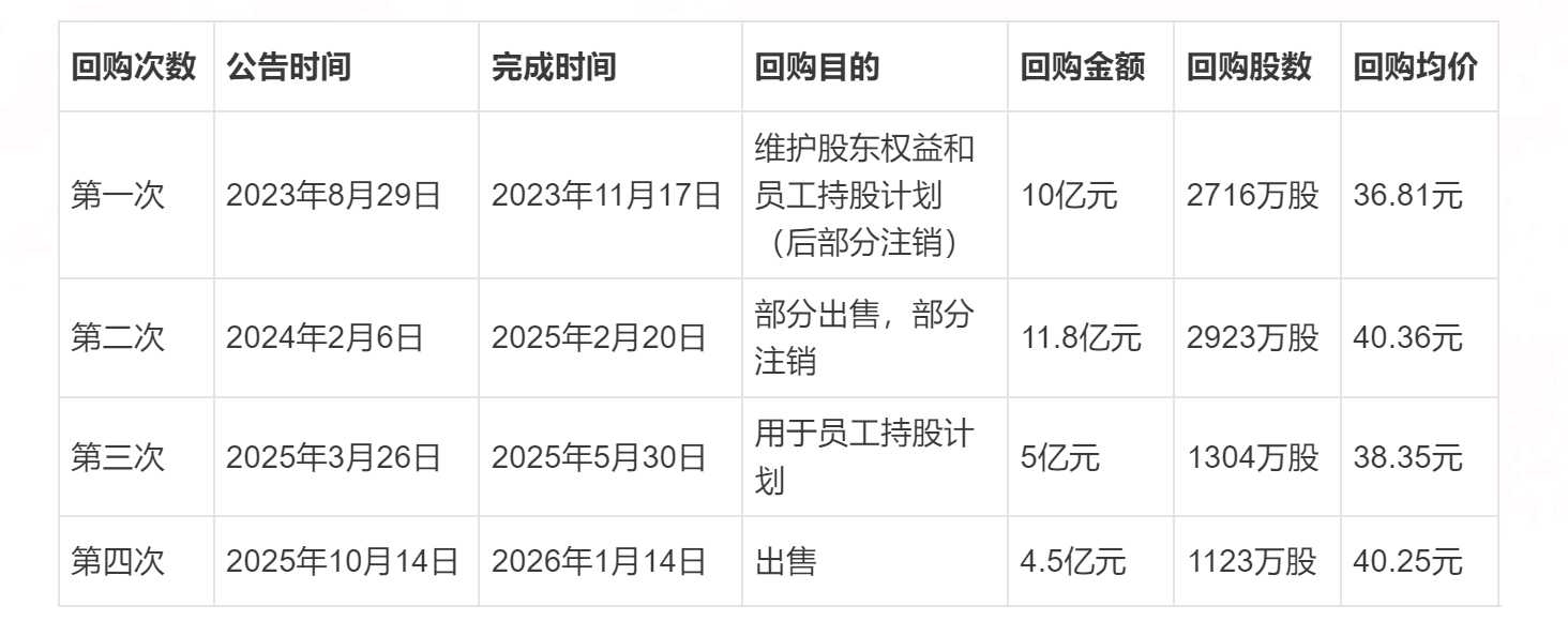 实际上这已经不是公司第一次股权回购了,如图所示,从2023到2025年,公司累计进行了四次股权回购,累计耗资31.3亿元